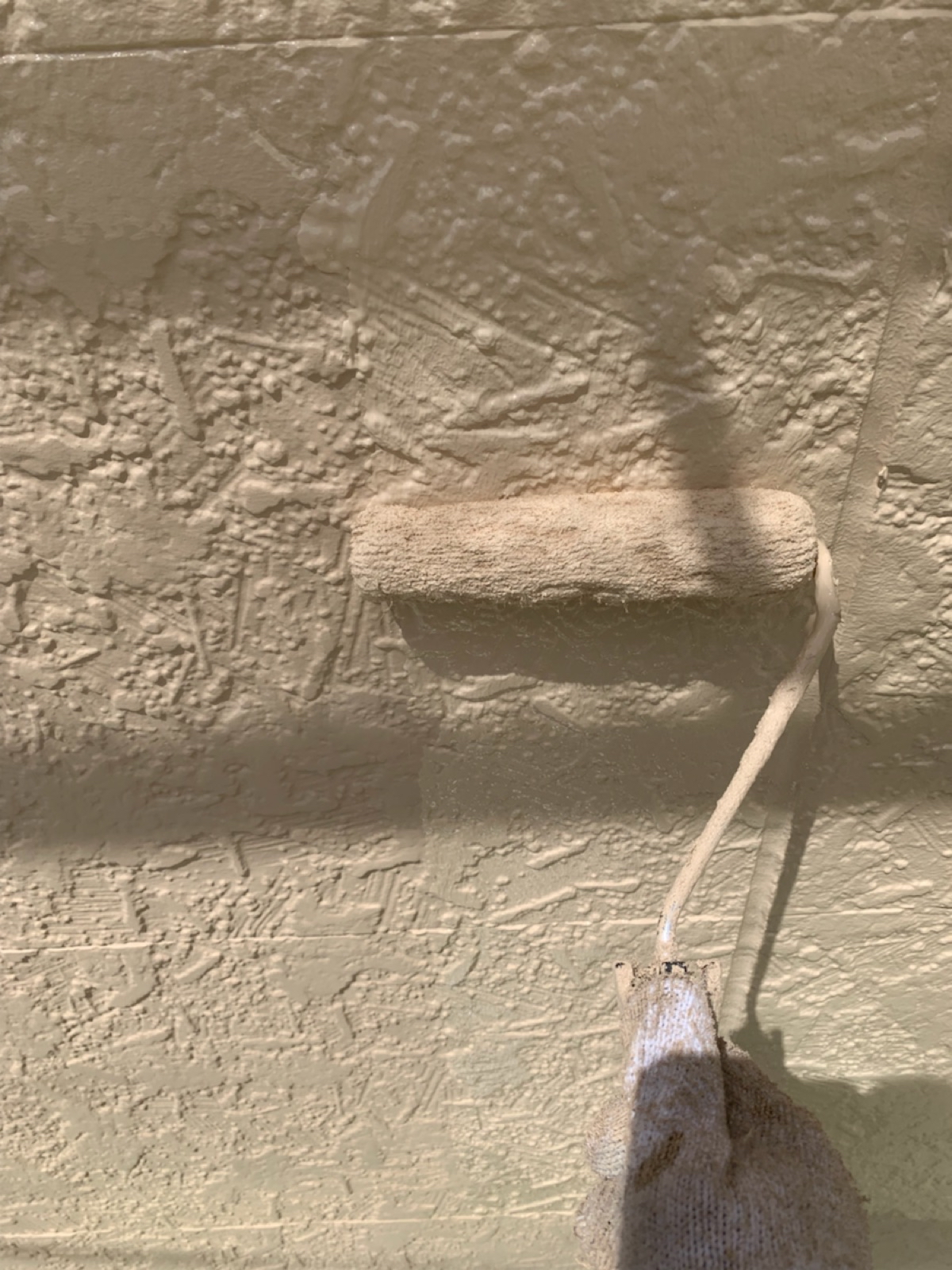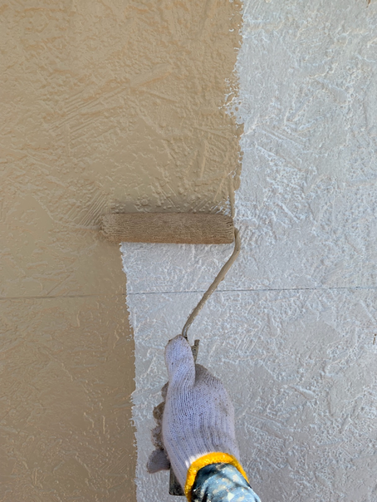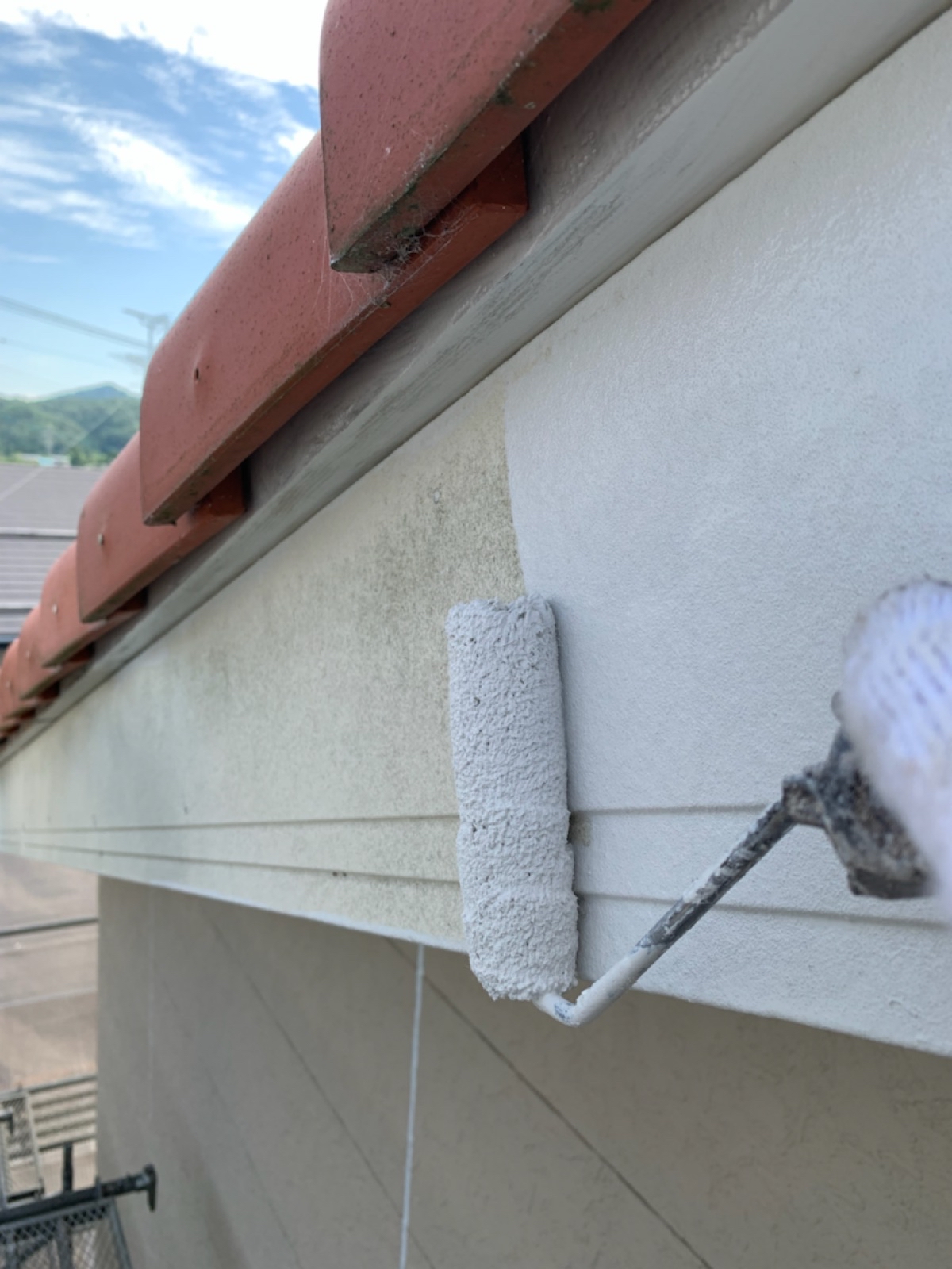 軒天:上塗り作業中