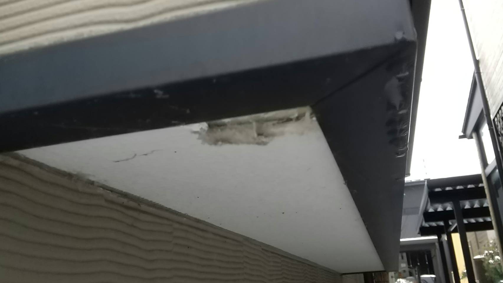 軒天が経年劣化により塗膜が剥がれていました。