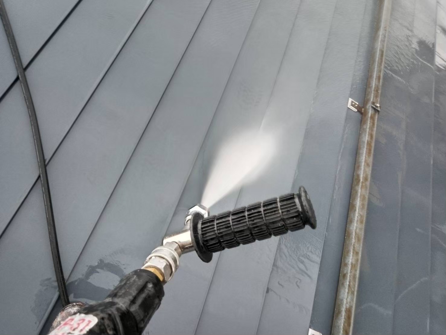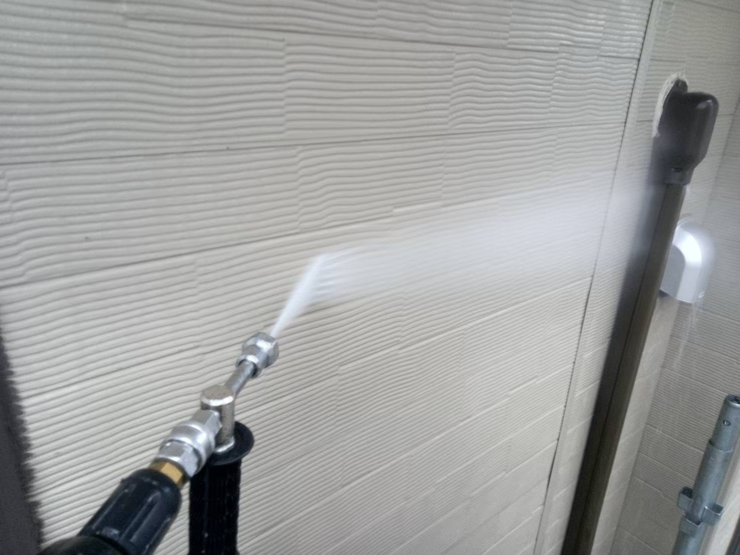 高圧洗浄作業中:古い塗膜や汚れを綺麗に除去します