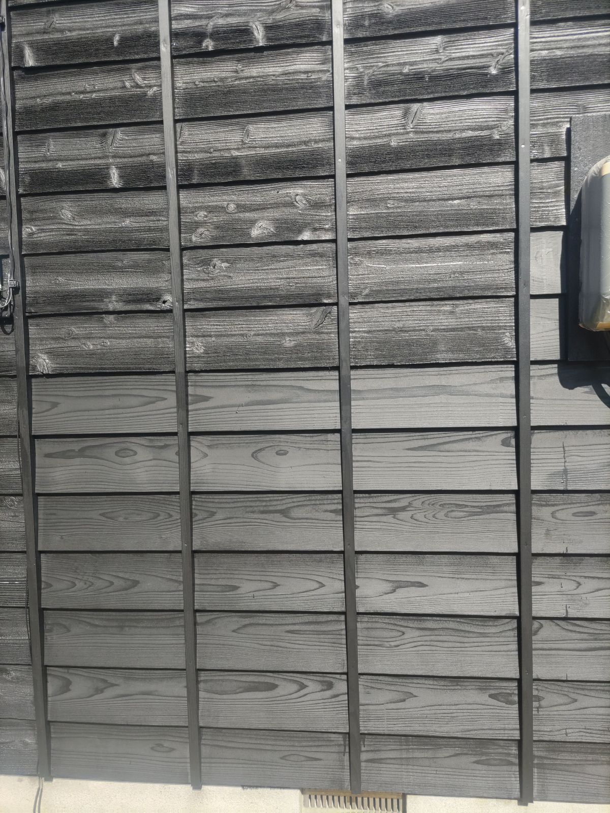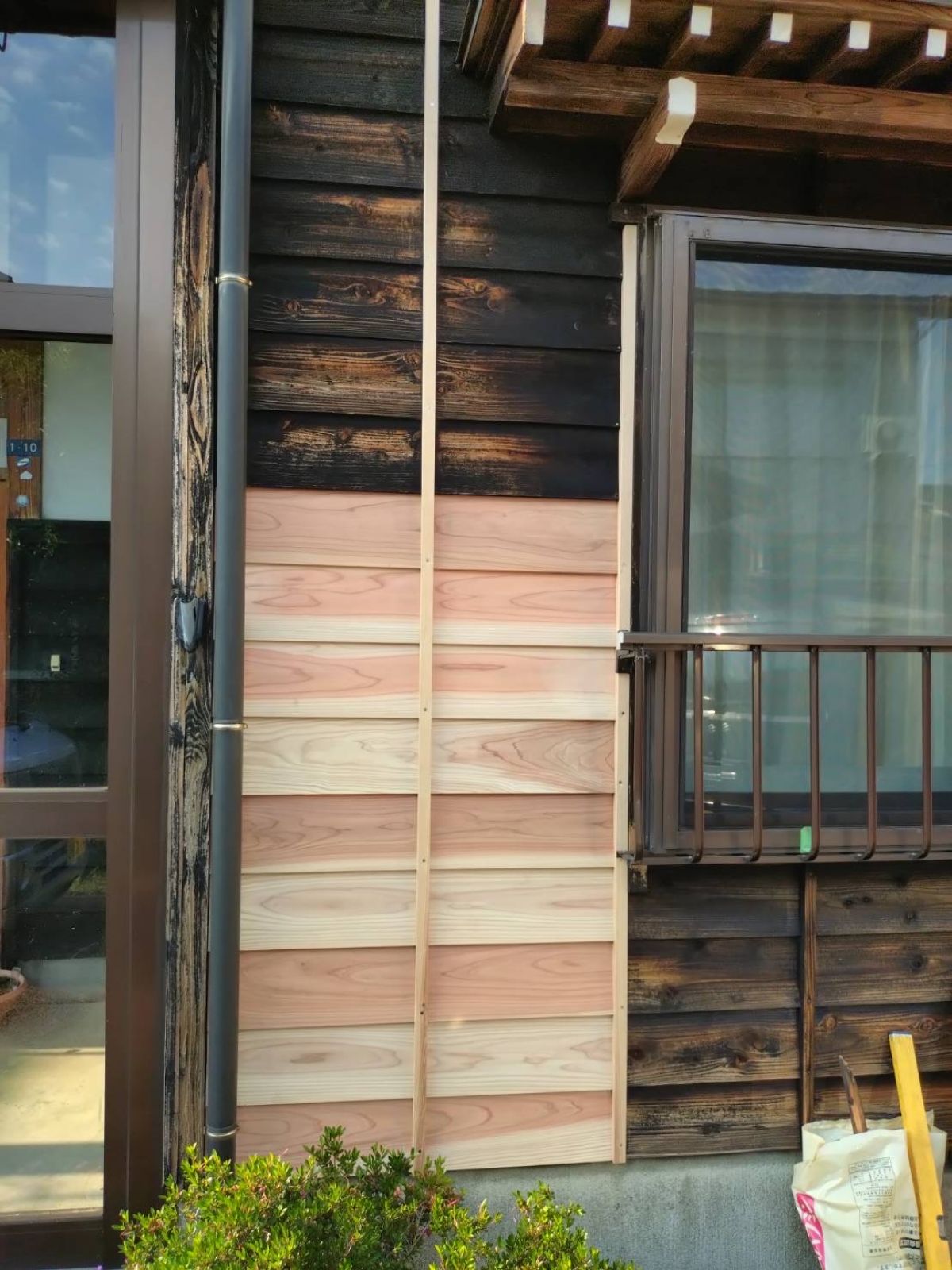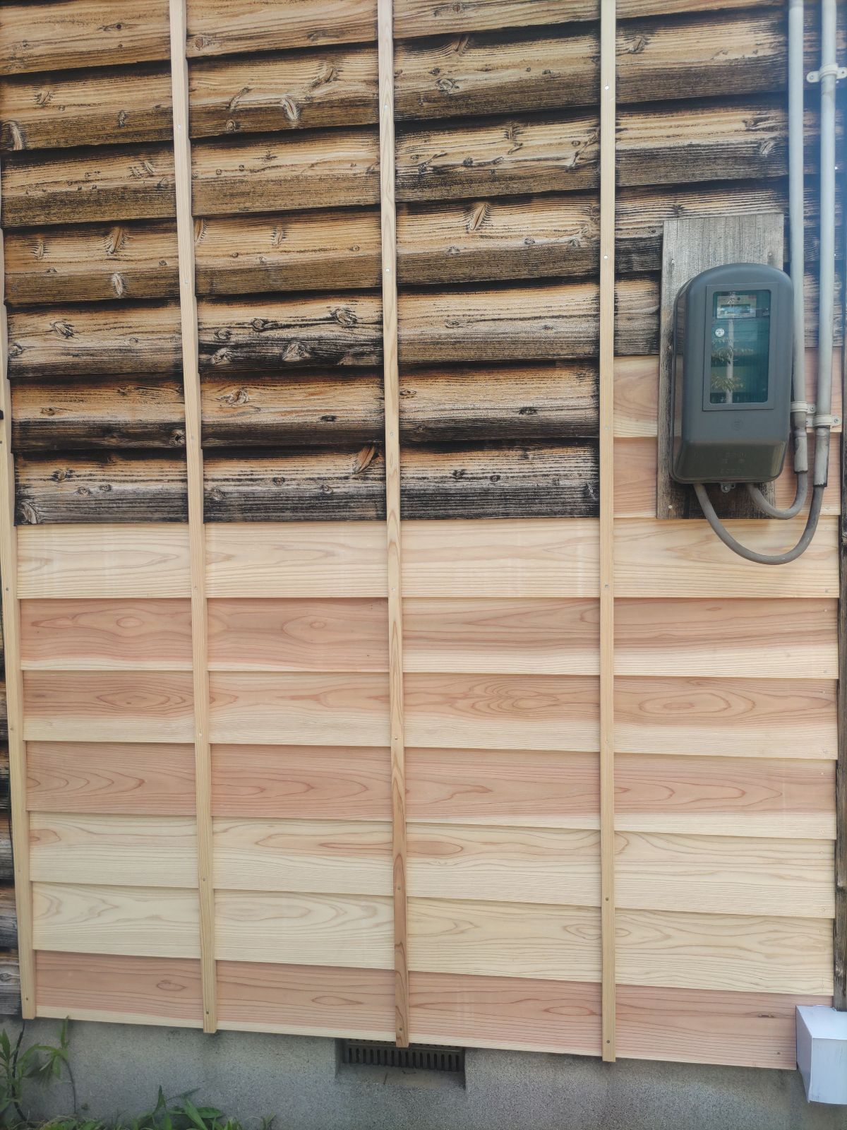 外壁塗装完了です。新しく張り替えた板と、既存の板の色も半造膜でしたら写真のように合わせる事ができます!