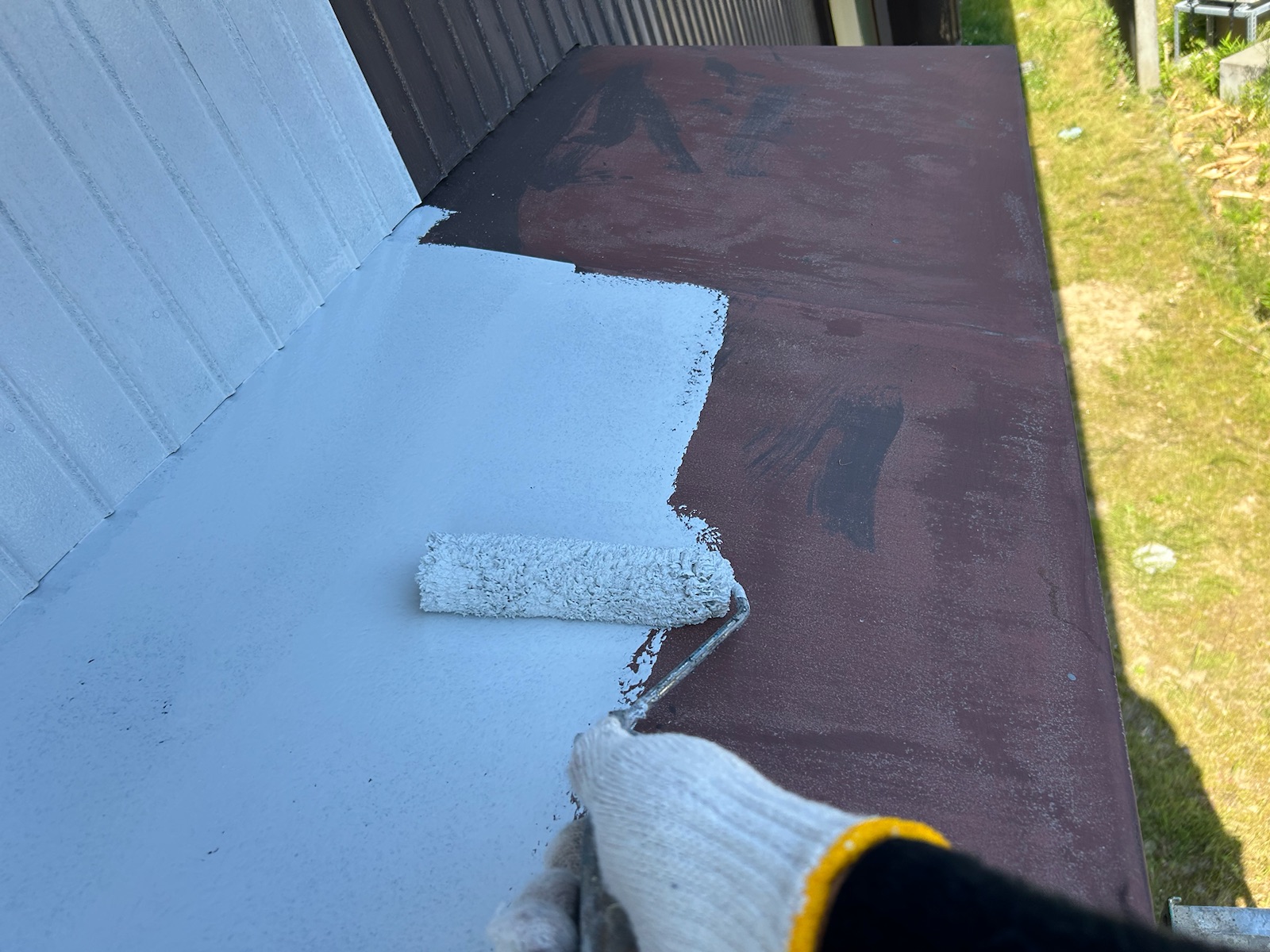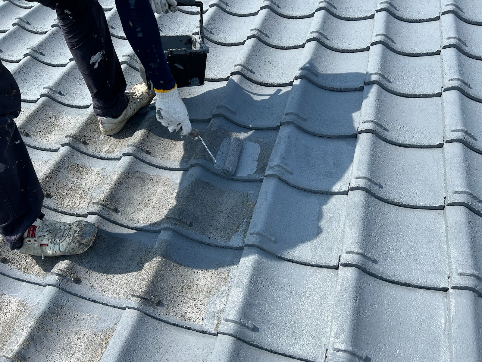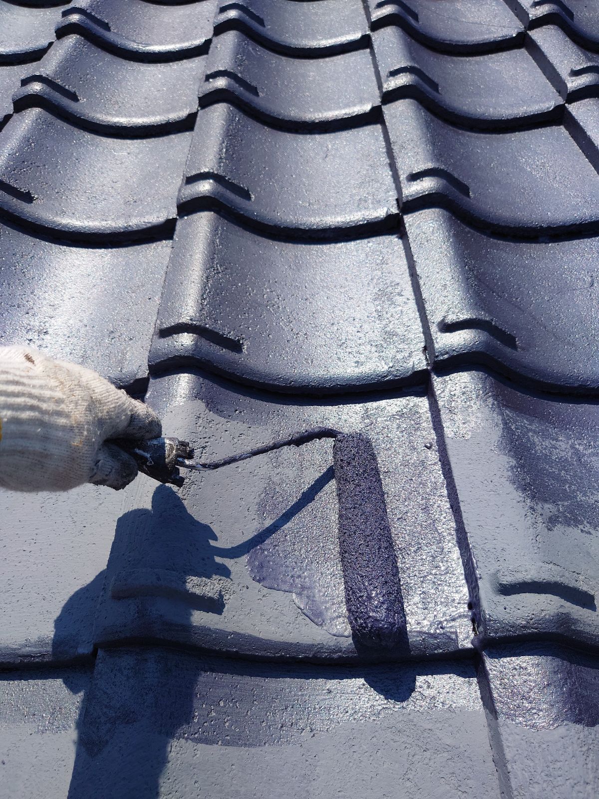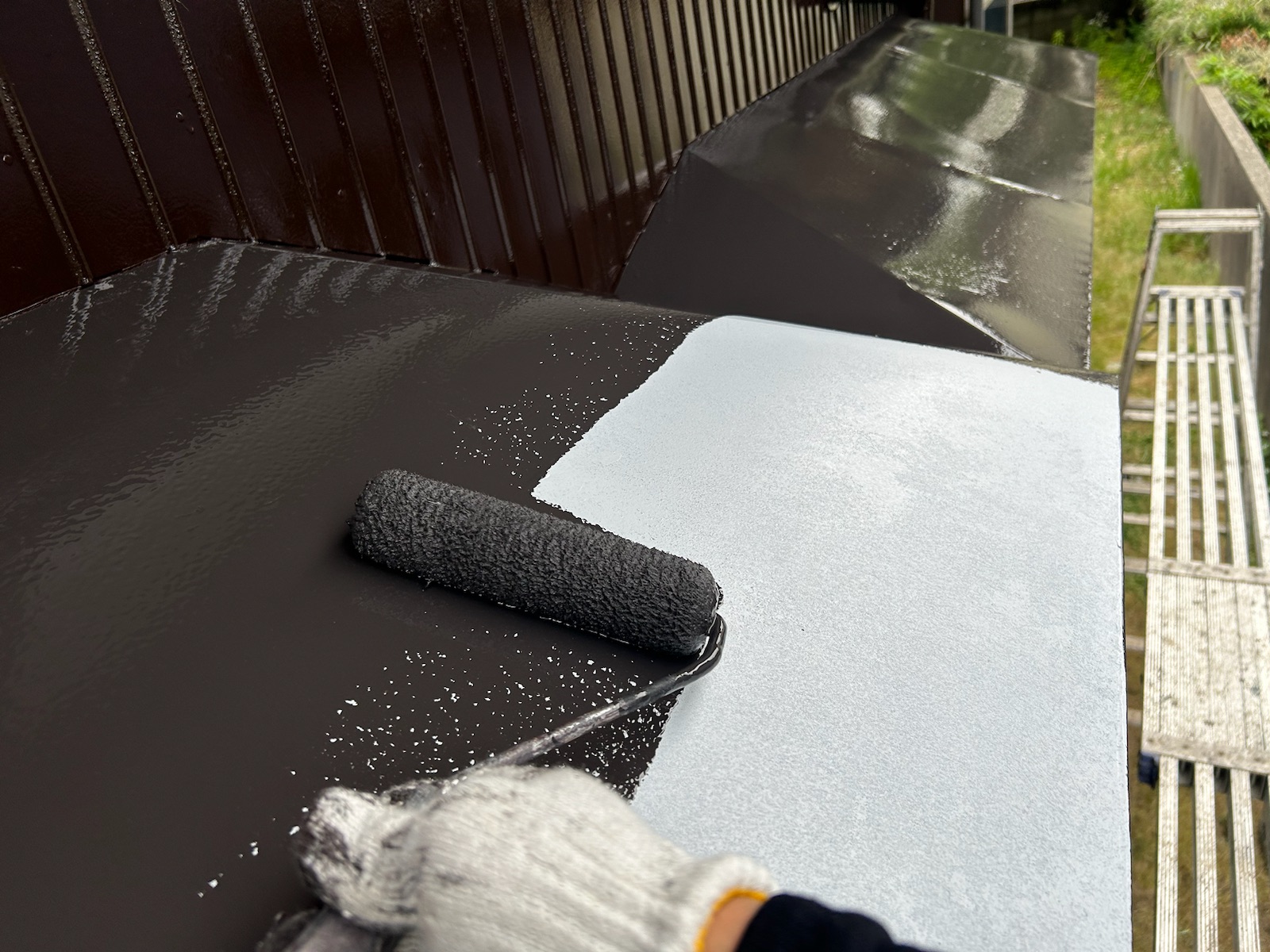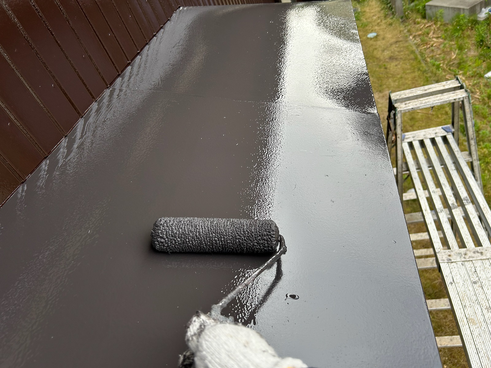 屋根:上塗り塗装の様子です。上塗り材を2回塗装して仕上げていきます。