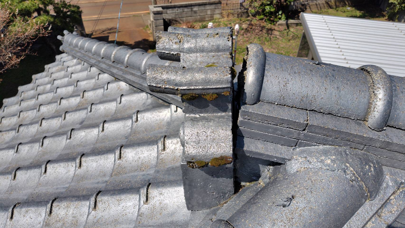 鬼瓦と棟瓦をつないでいる金具が錆びていて、金具がなくなっています。鬼瓦と土台のモルタル部分が経年劣化の影響でセメントが崩れてしまい、固定されていない状態でした。