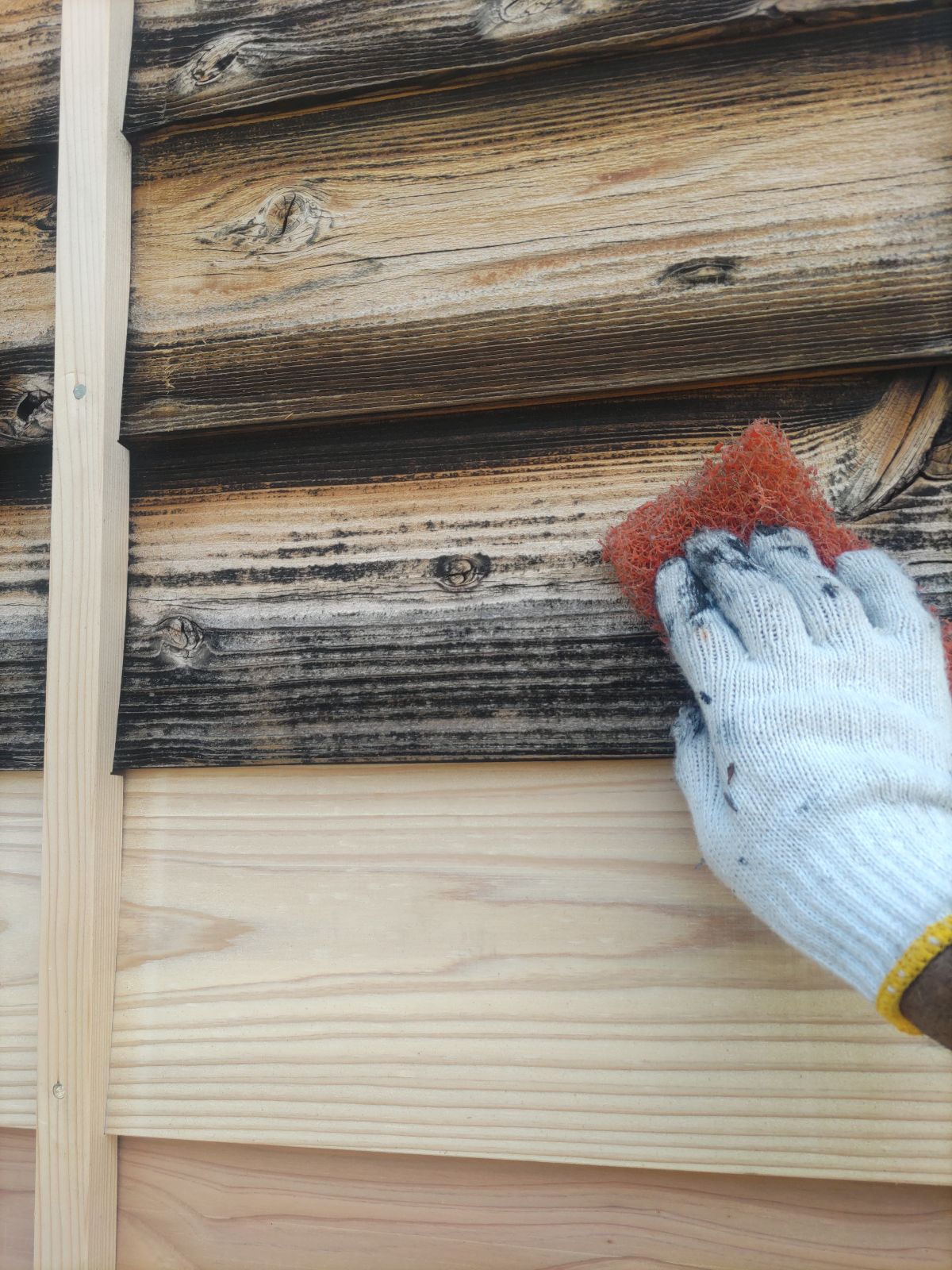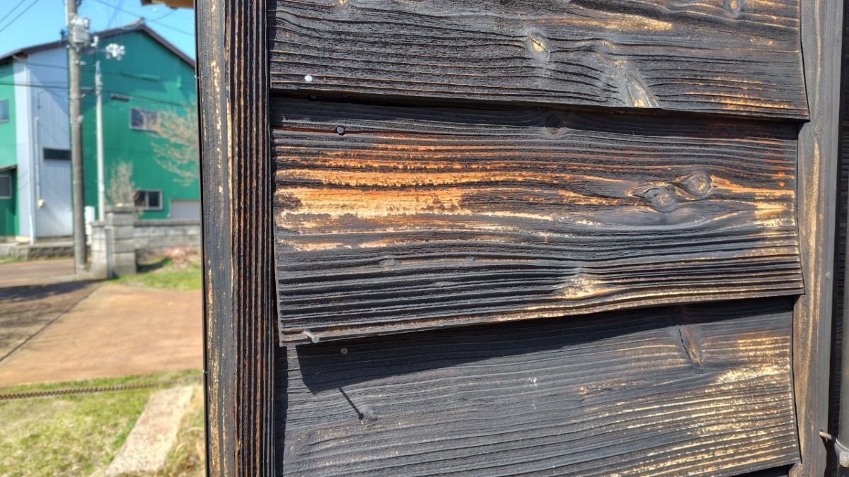 外壁に使われている杉下見が経年劣化により反っている状態です。