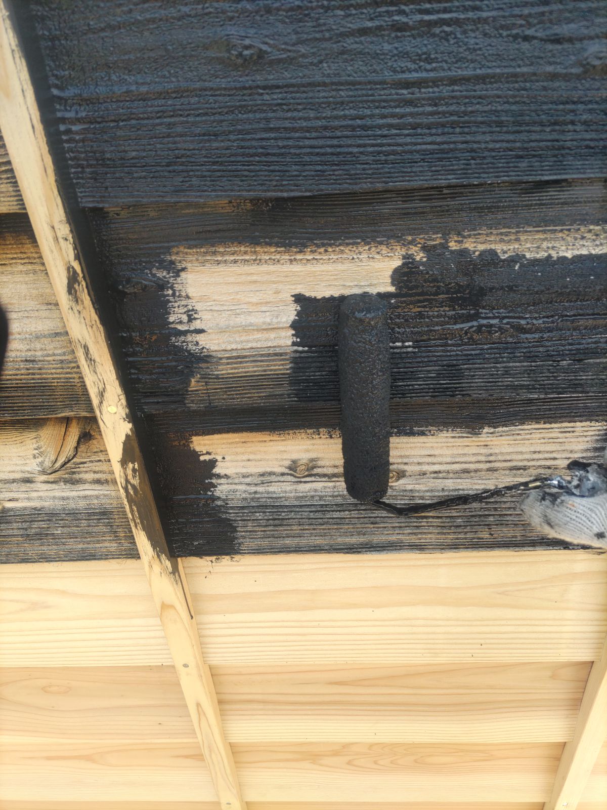 下塗り塗装中です。今回は半造膜タイプの塗料を使用しています。この塗料には防カビ・防虫・防腐効果をもっている木部専用塗料です。半造膜タイプなので木目が出づらくなりますが、外壁材をしっかりと保護してくれる役割があります。