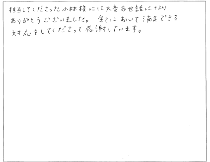 担当してくださった小林様には大変お世話になりありがとうございました。全てにおいて満足できる対応をしてくださって感謝しています。