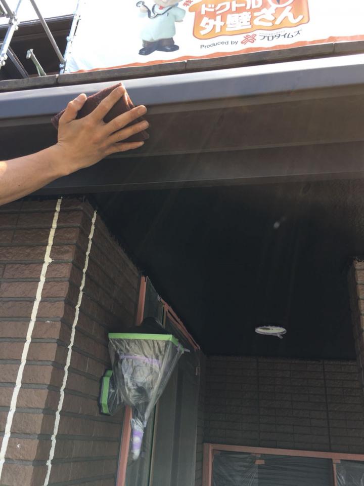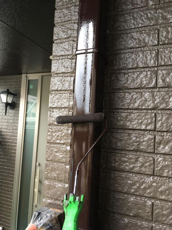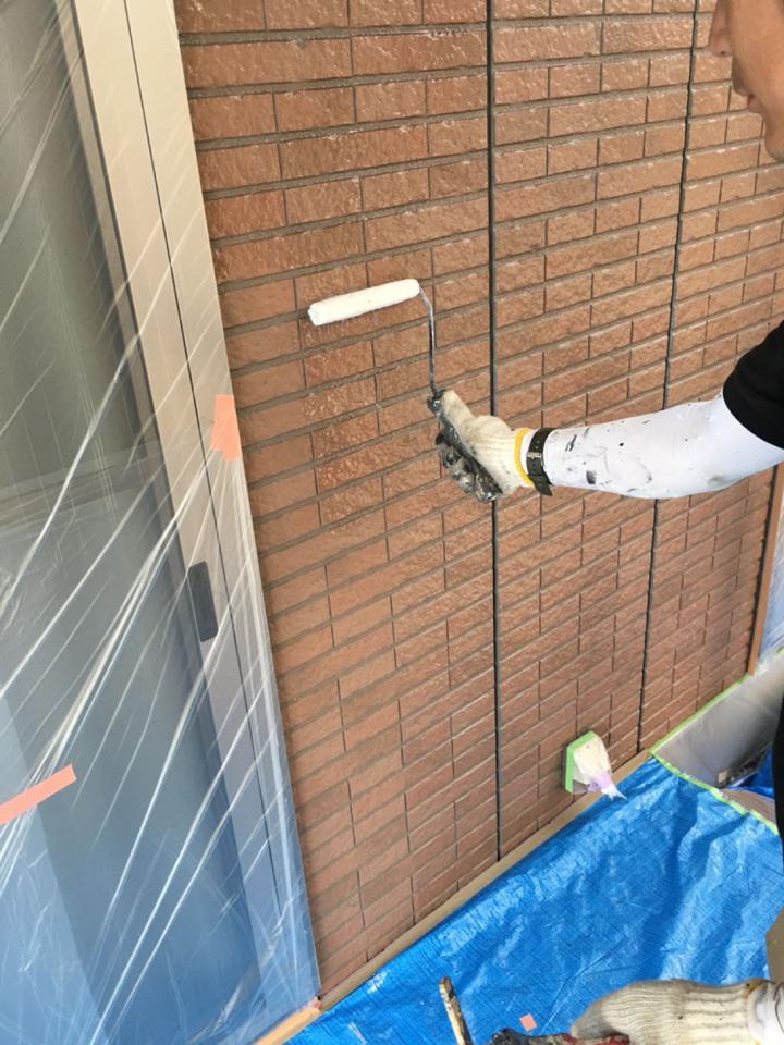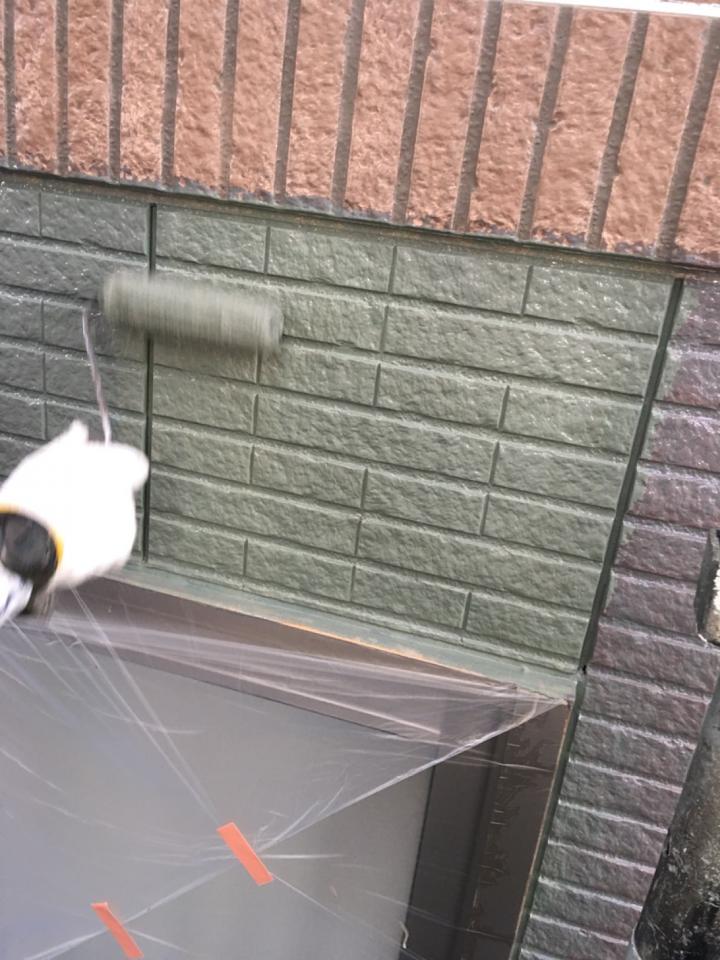 外壁塗装 上塗り1回目 この材料は顔料が特殊でここから色がかなり変わります。