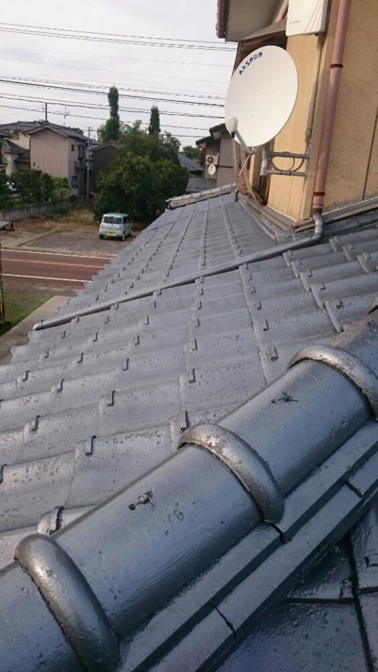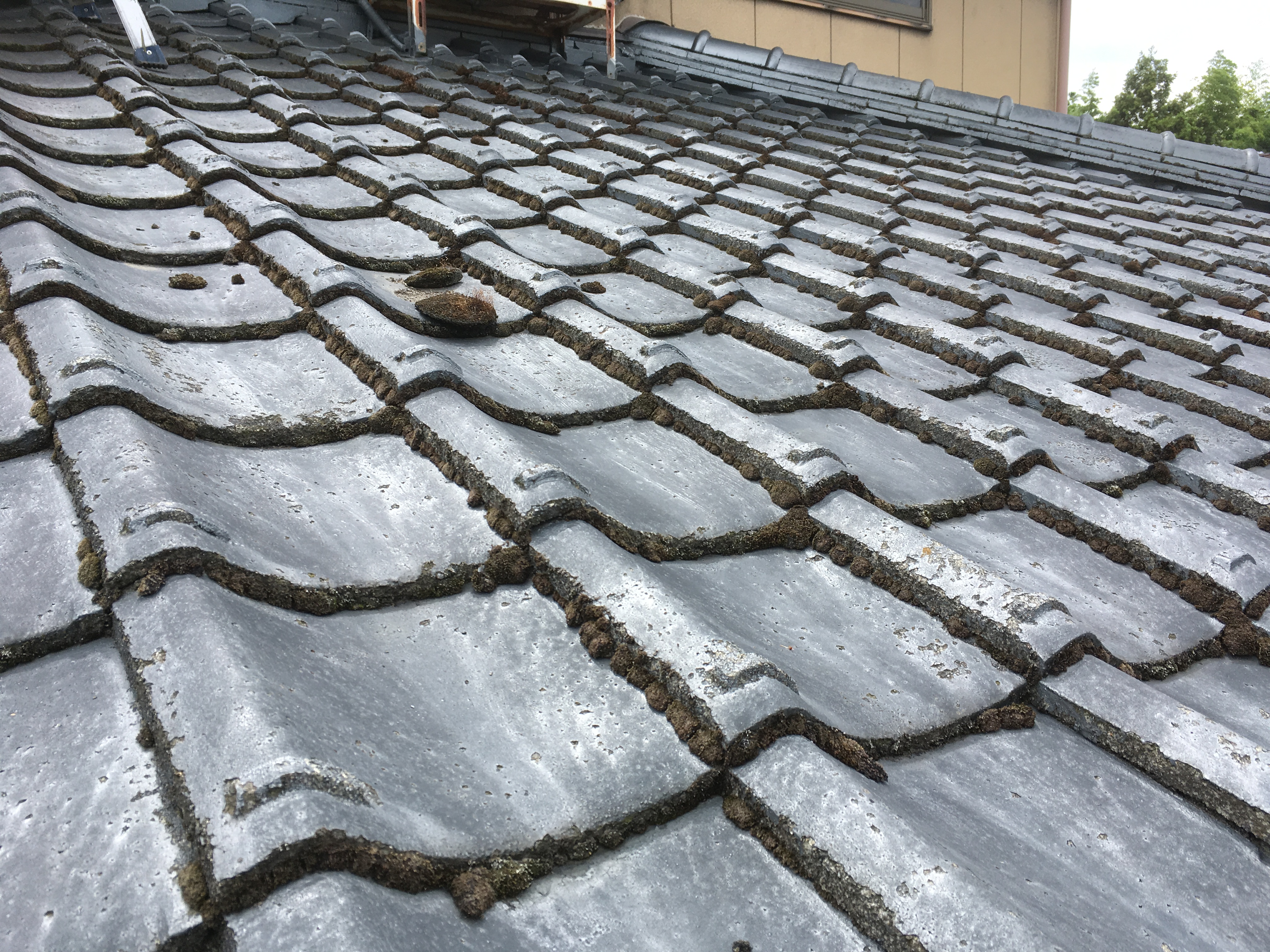 7年周期で屋根の塗り替えをされているお客様です。アクリル塗装を何度も塗装している為無理に圧膜をつけることを避け、今回もアクリル塗装の吹付仕様とさせていただきました。