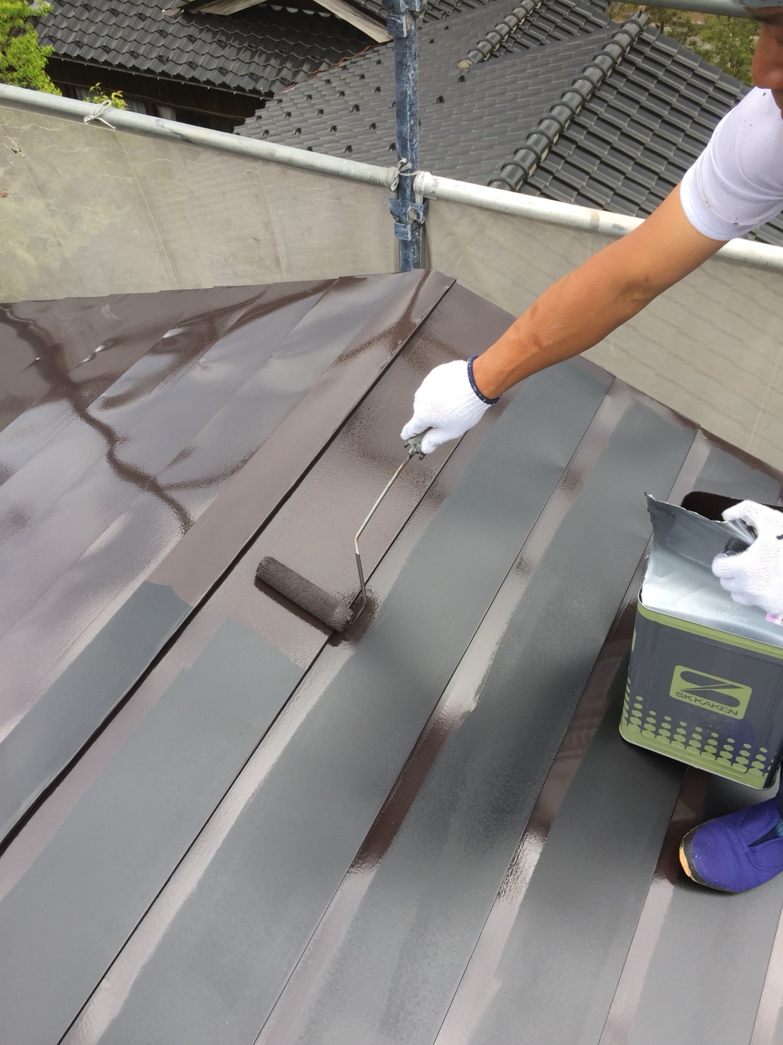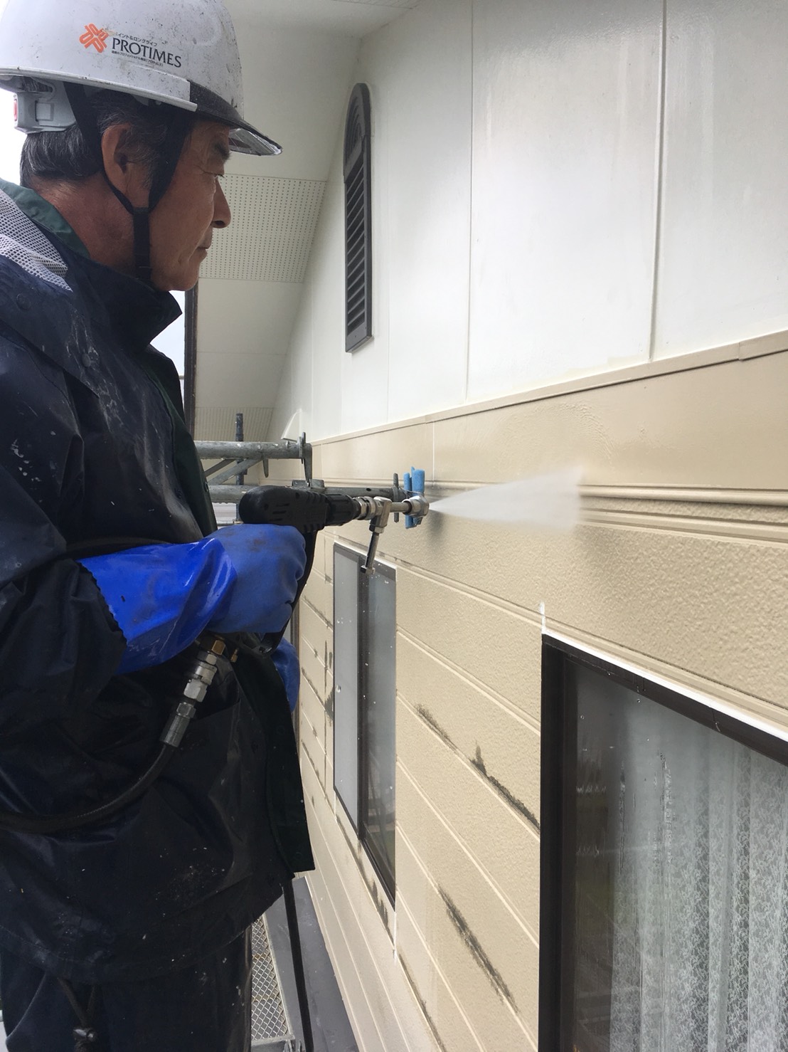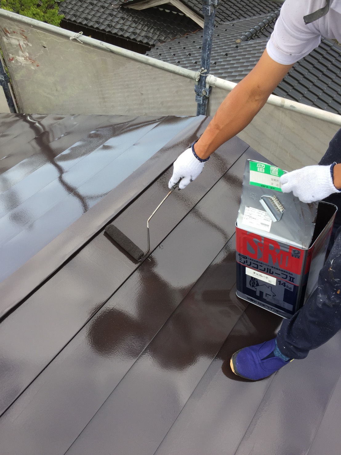 外壁上塗りには汚れがつきにくく、無機成分が配合されているリファインを使用させていただき、