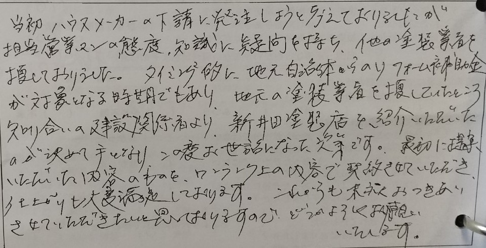 新井田塗装店を紹介していただいたのが決め手となり、この度お世話になった次第です。