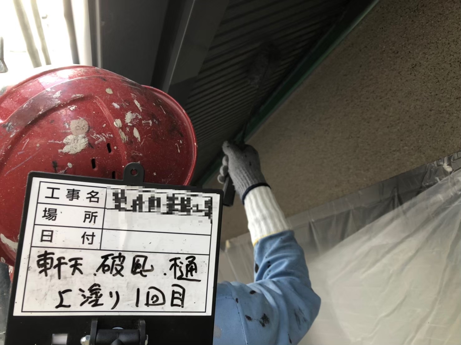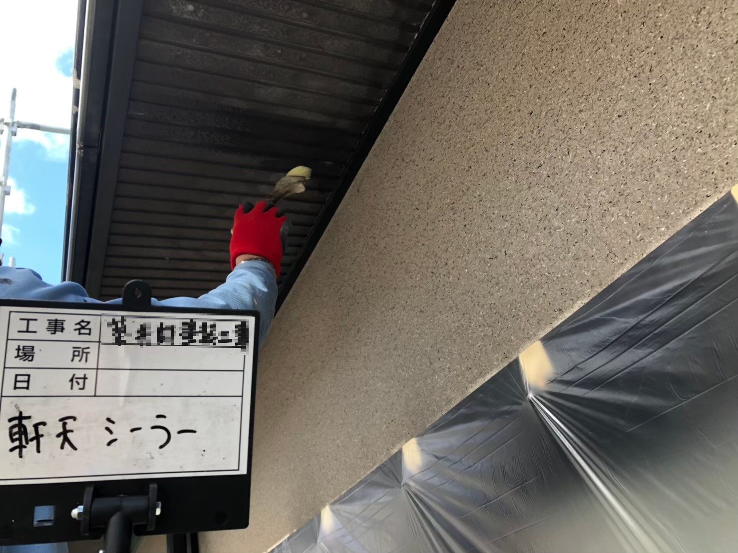 軒天:上塗り作業中