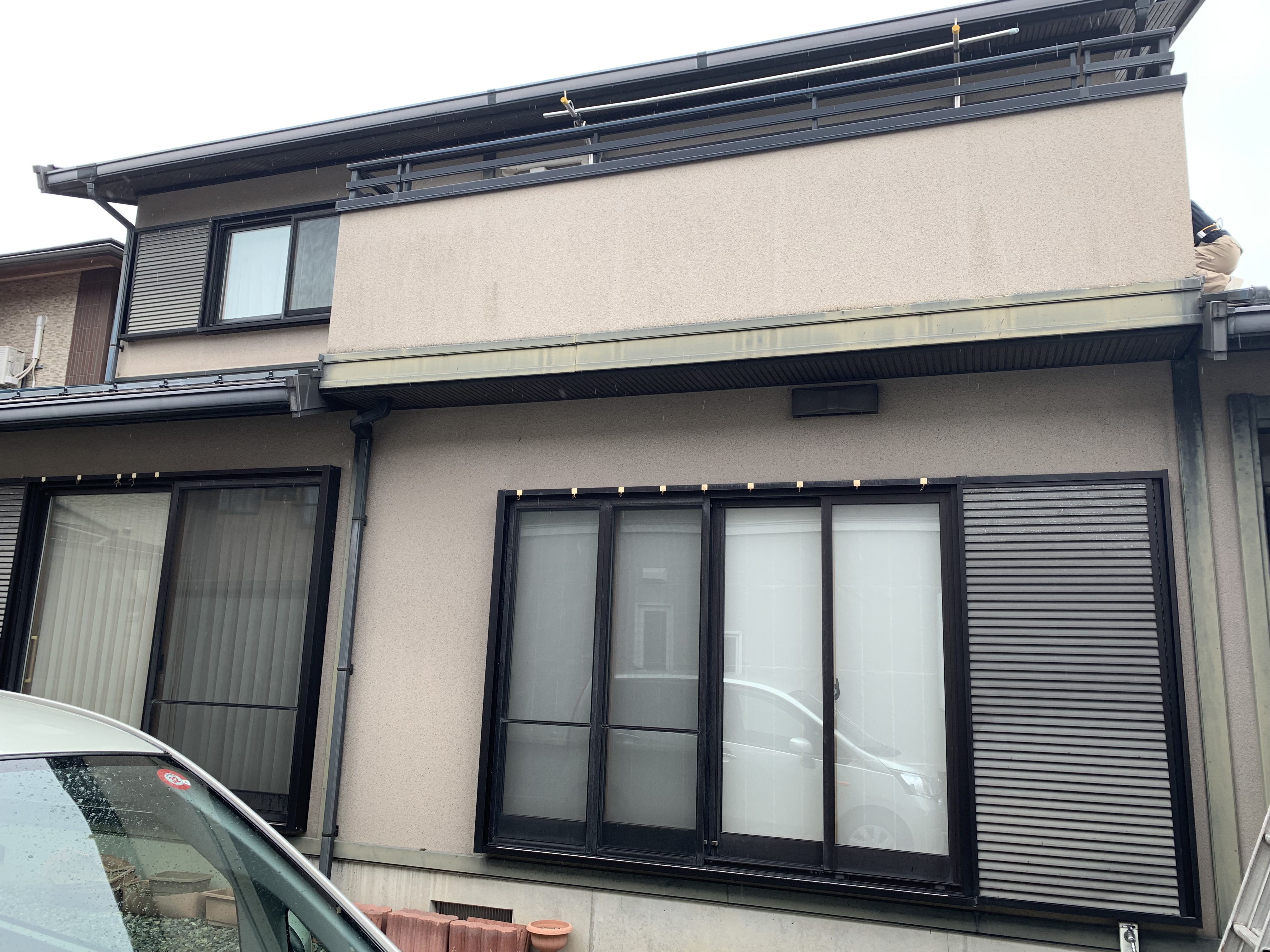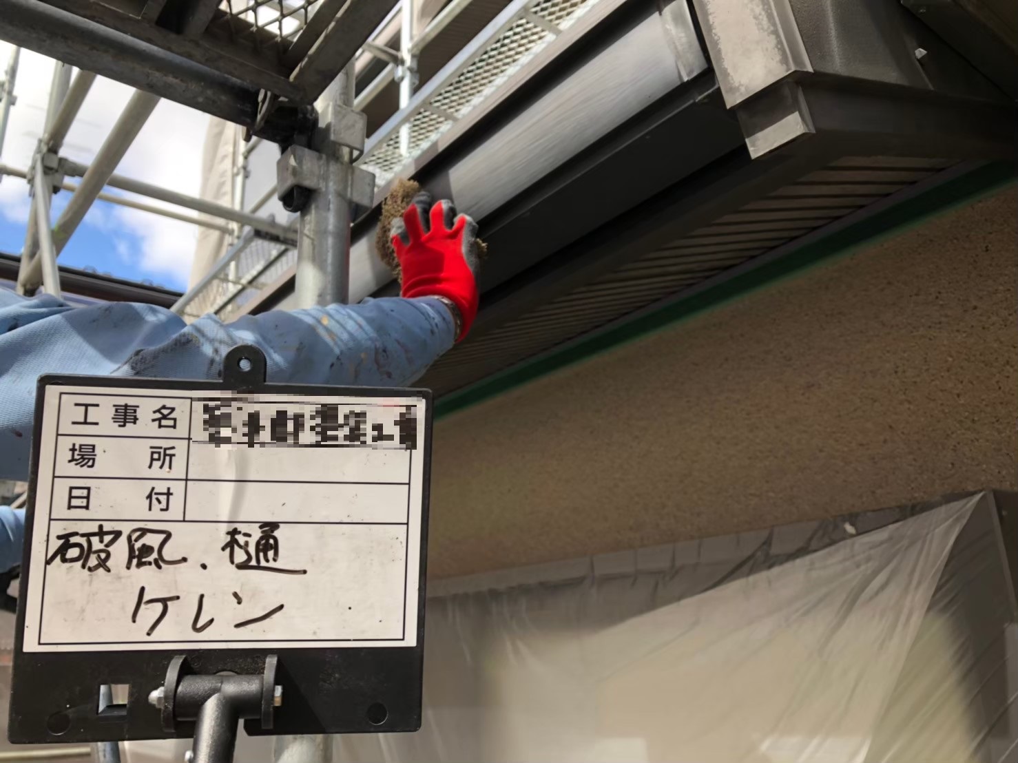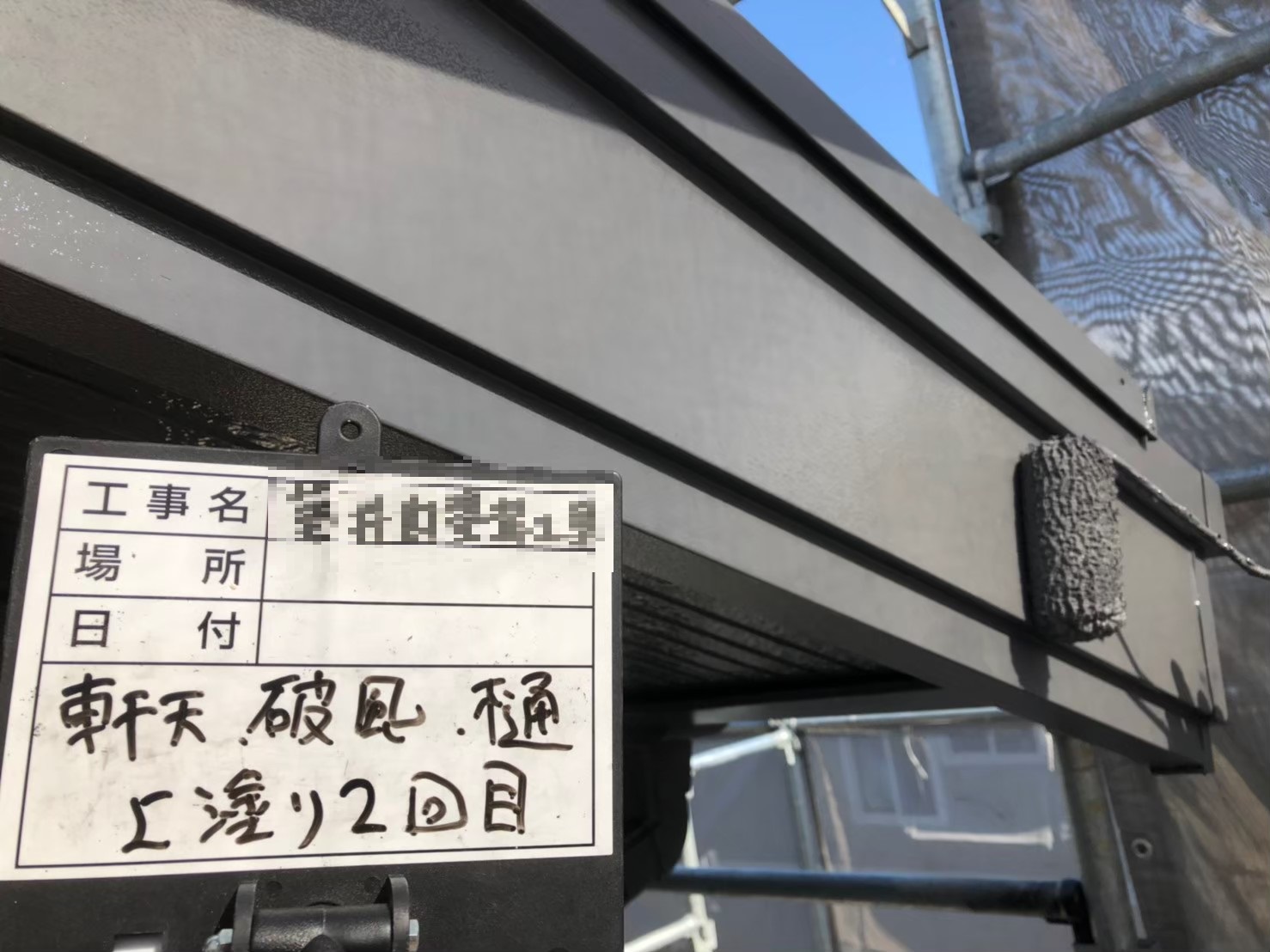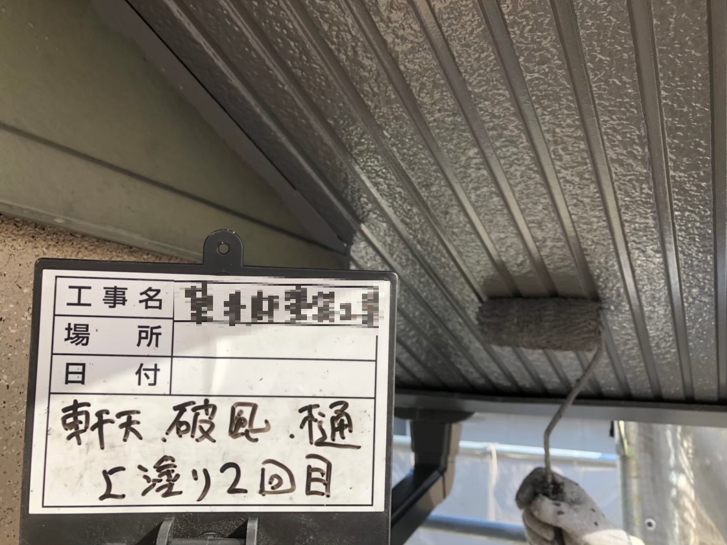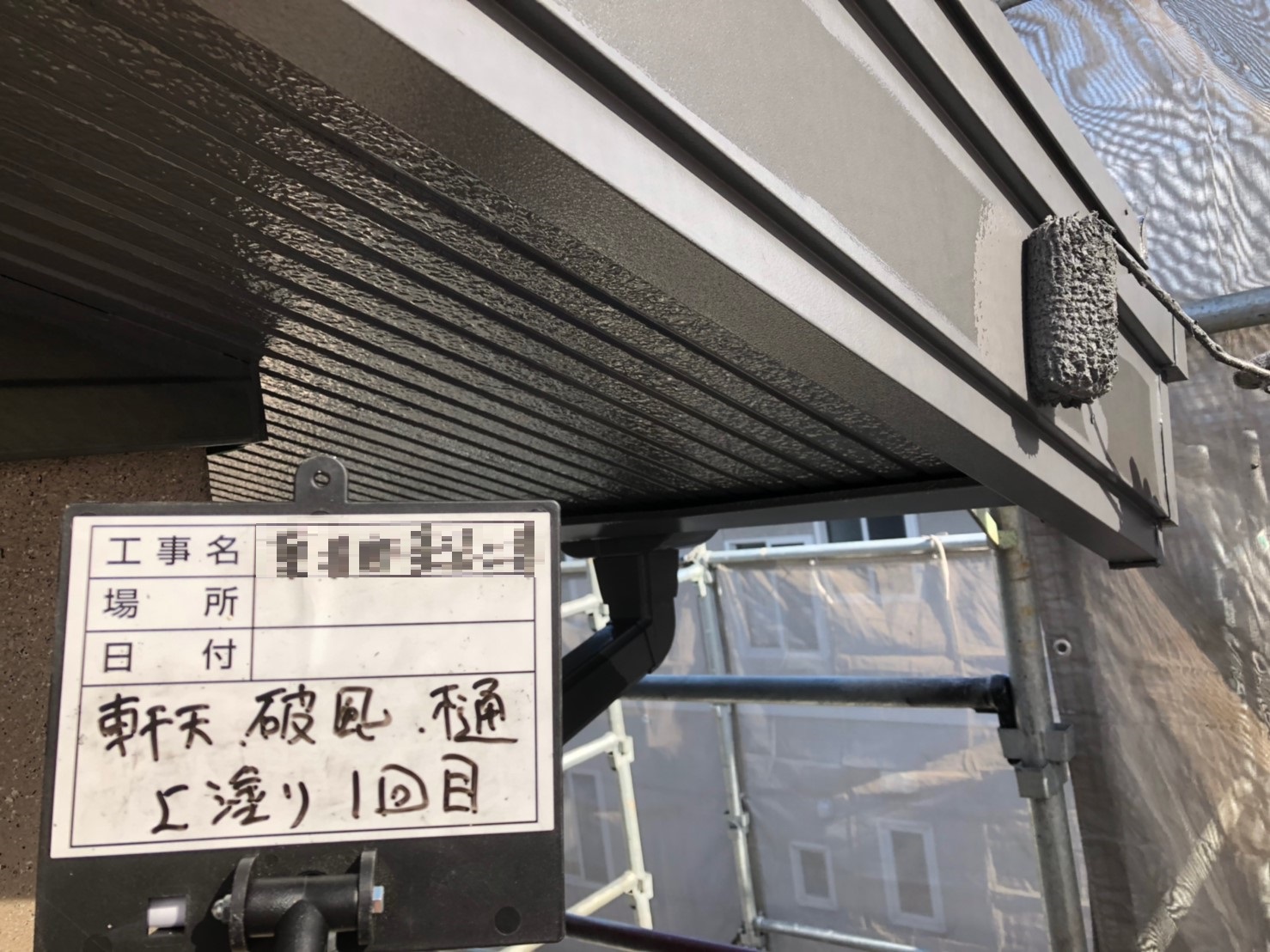 軒天:中塗り作業中