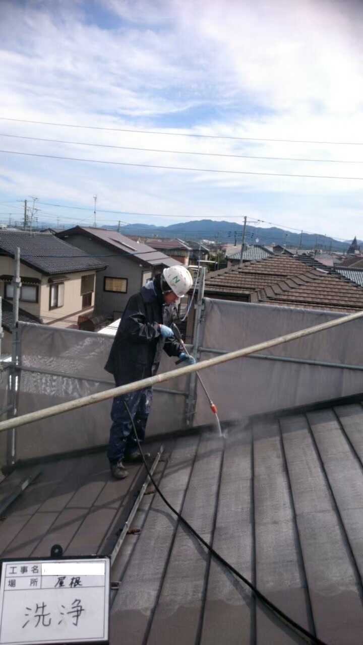 屋根:高圧洗浄作業中