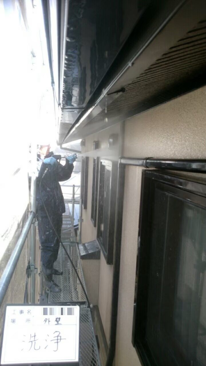 外壁:高圧洗浄作業中