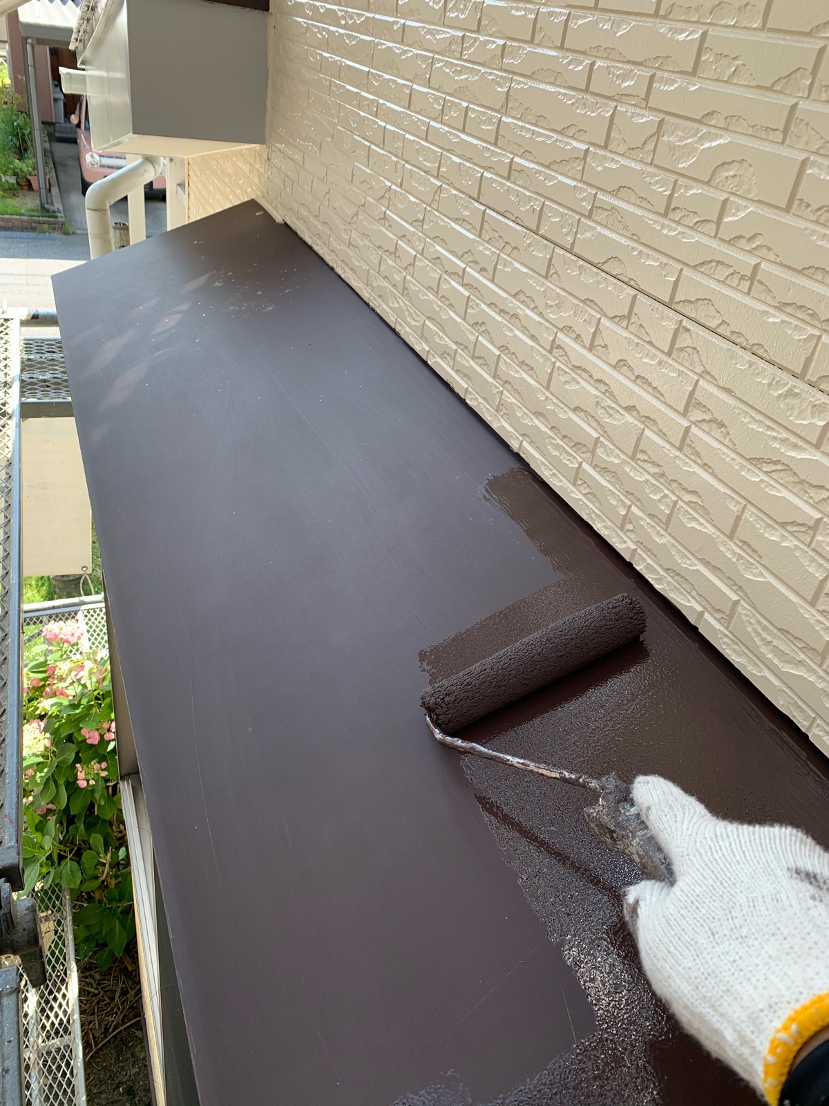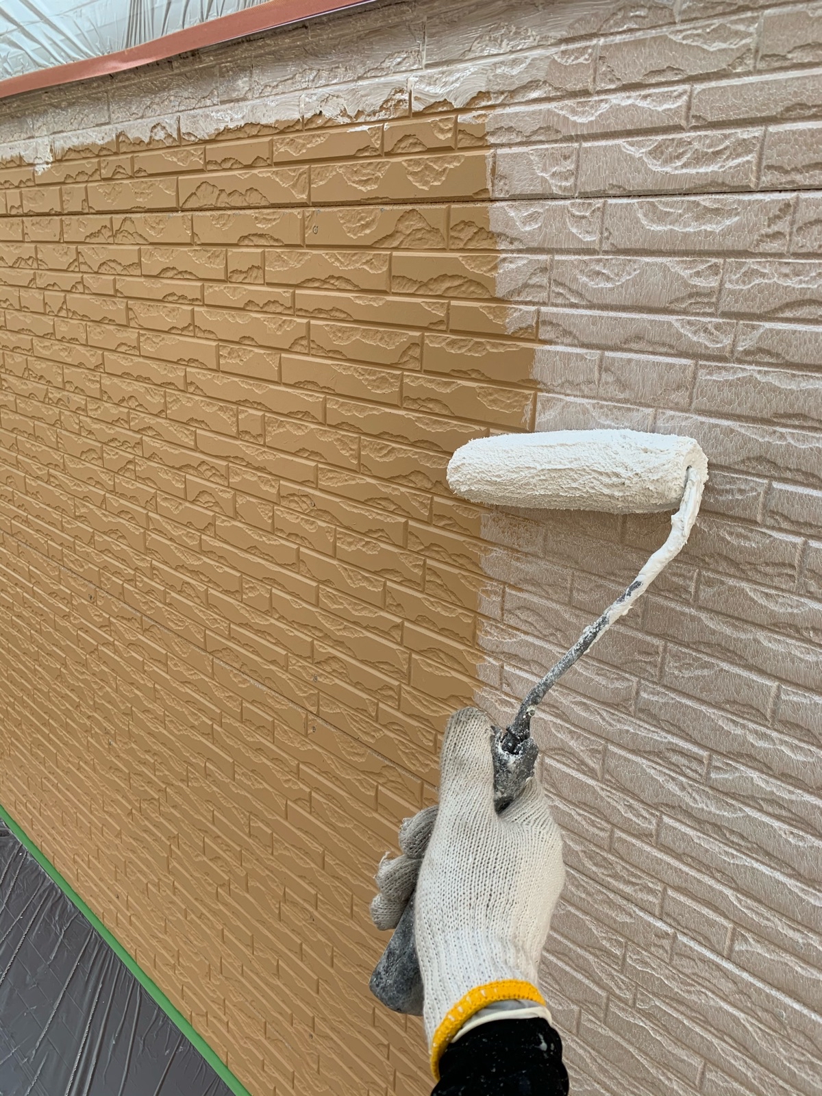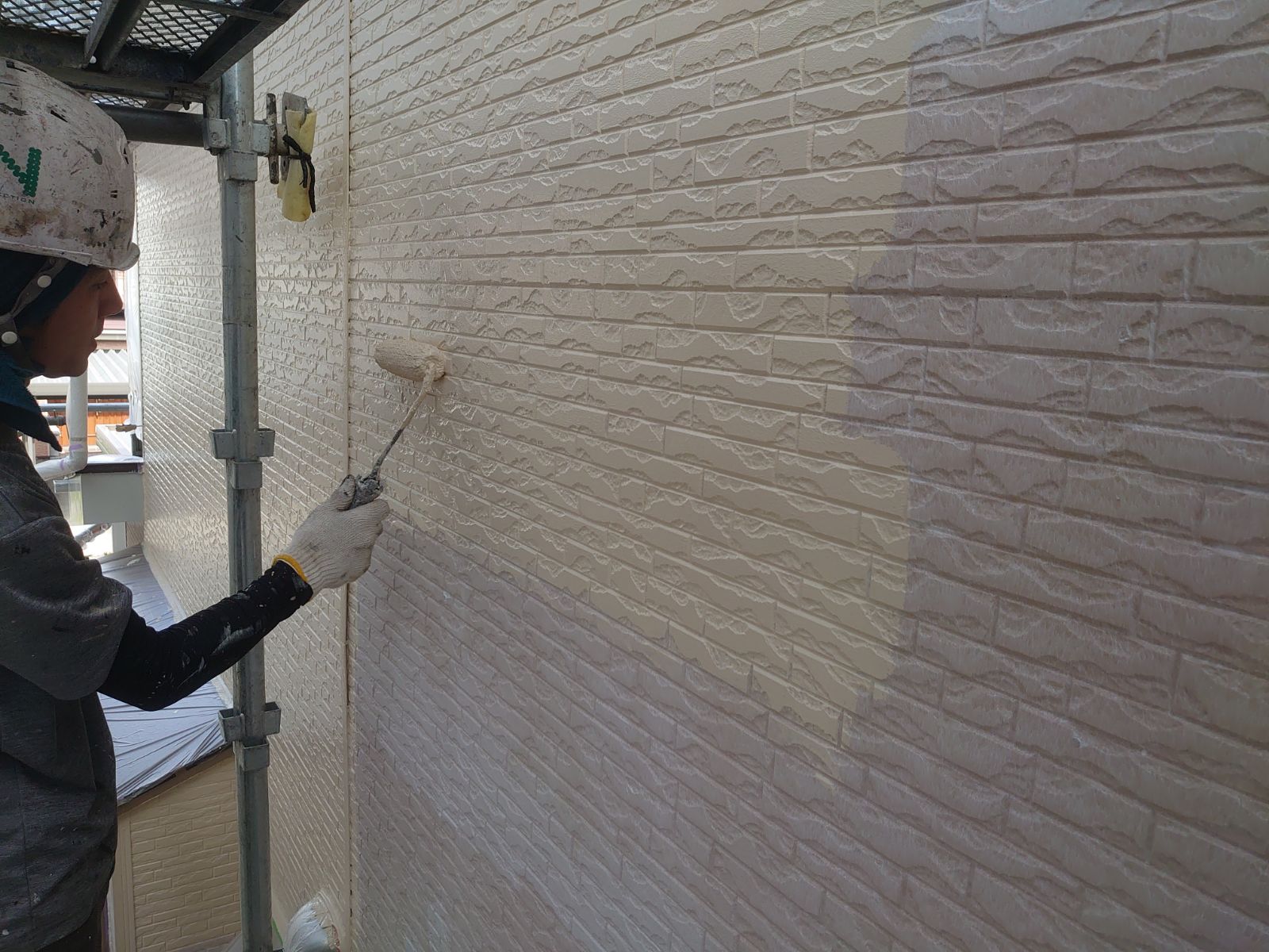 中塗り作業中:上塗り材は超低汚染リファイン1000Si-IRを使用しました。