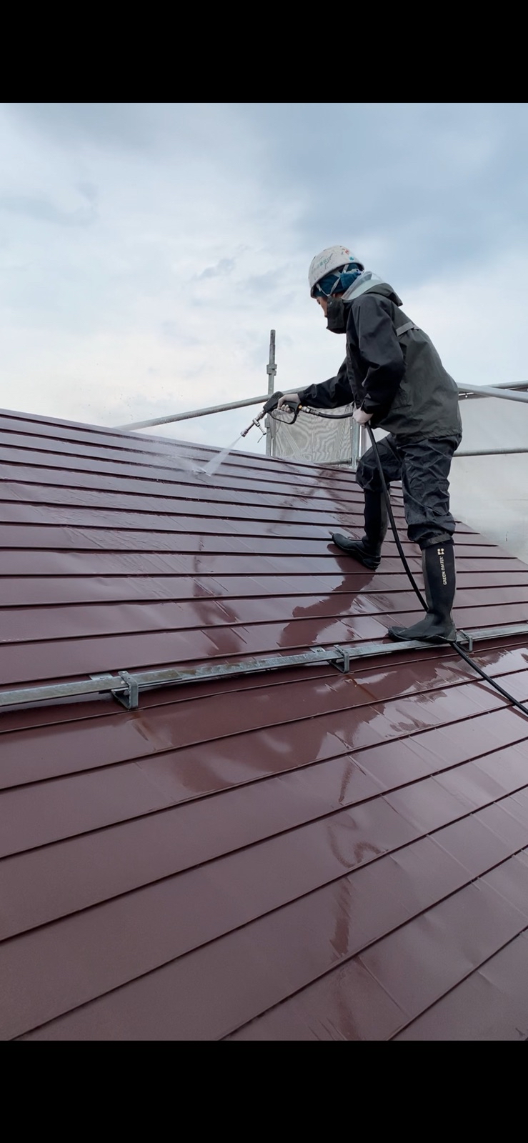 高圧洗浄作業中:古い塗膜や汚れなどを綺麗に洗います。