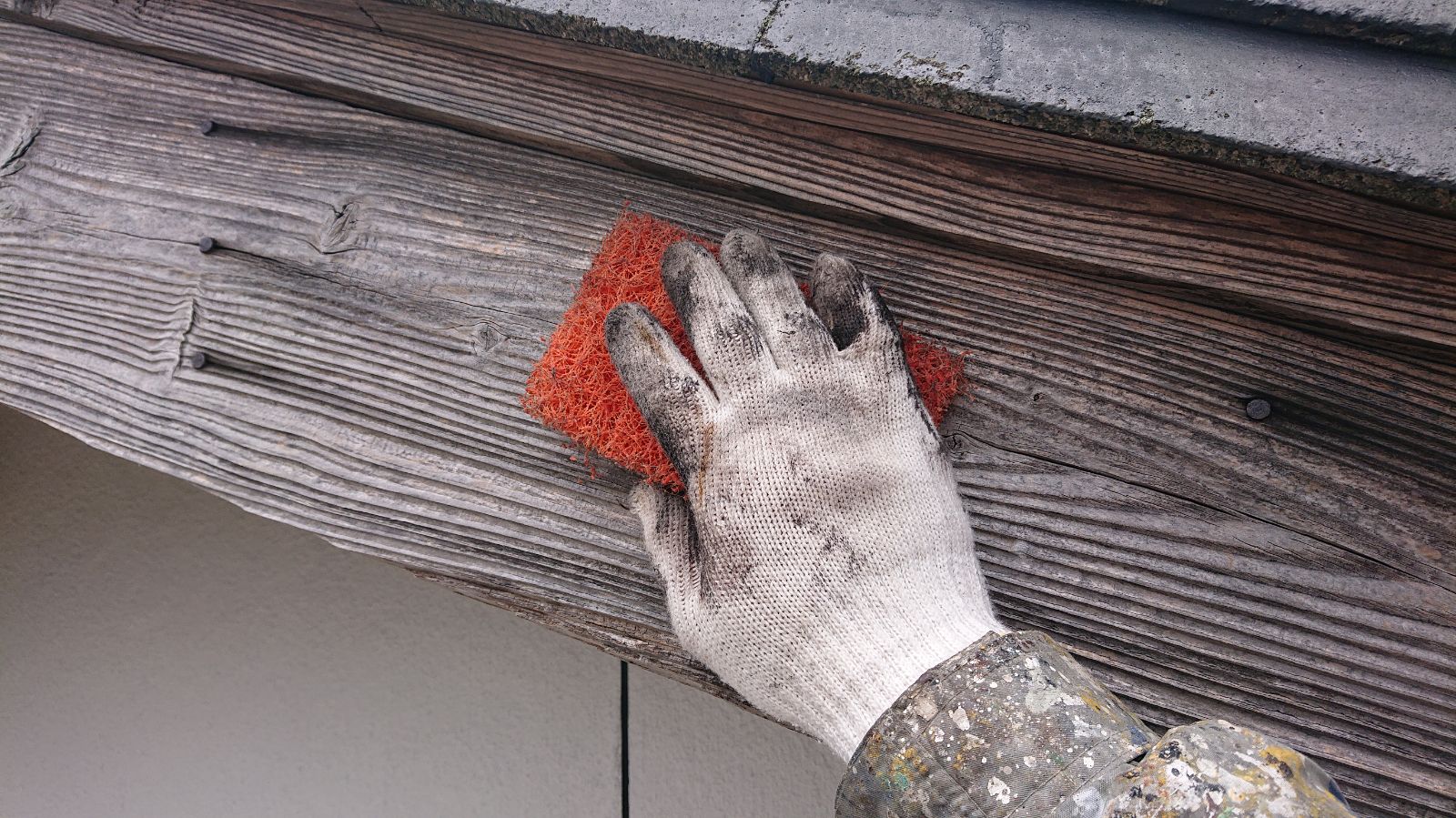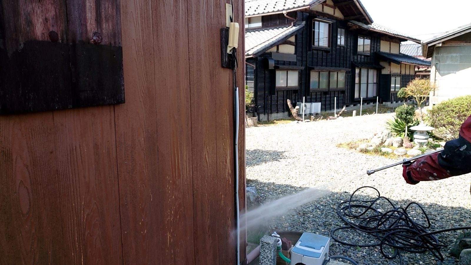 高圧洗浄作業中:古い塗膜や汚れなどを綺麗に洗います。