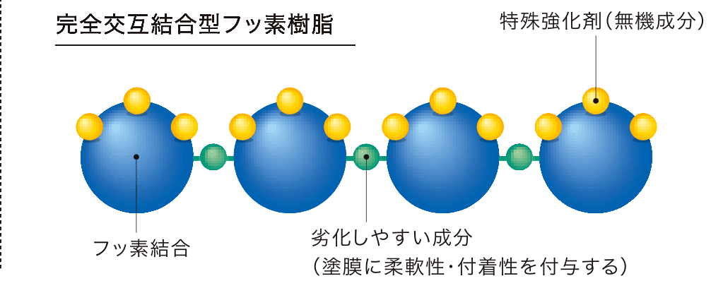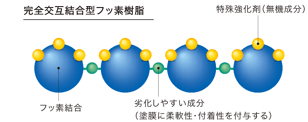 規則的な交互結合のため結合力が強く紫外線による劣化を抑える「完全交互結合型フッ素樹脂」を採用。さらに、劣化に強い特殊強化剤(無機成分)をフッ素結合に固着させることで、さらなる高耐候性を実現。