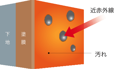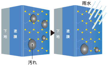 親水性(水になじみやすい性質)により、塗膜に汚れが付着しても、汚れの間に水が入り込み、汚れを洗い流す。